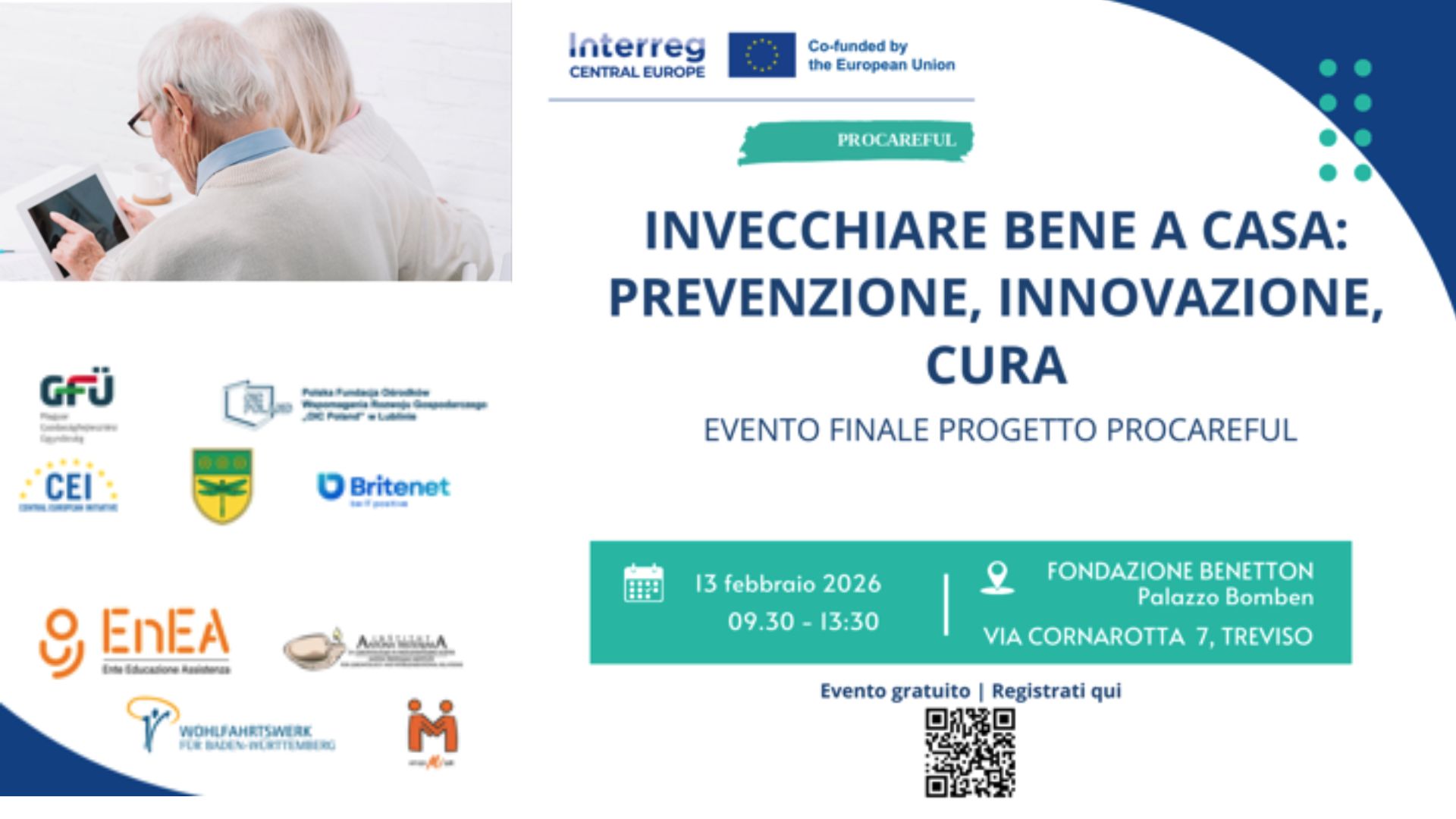 Siamo lieti di invitare tutti gli interessati all’evento “Invecchiare bene a casa: prevenzione, innovazione, cura”, che si terrà il 13 febbraio 2026 presso Fondazione Benetton, Treviso. La conferenza rappresenta un importante momento di confronto e condivisione, riunendo esperti, organizzazioni e decisori provenienti da tutta l’Europa Centrale per affrontare una delle sfide più rilevanti della nostra società: promuovere un invecchiamento sano, attivo e sicuro a domicilio. L’evento sarà strutturato attorno a tre pilastri fondamentali: la prevenzione, l'innovazione e la cura, offrendo una panoramica su soluzioni concrete, modelli di intervento innovativi e strategie future per migliorare la qualità della vita delle persone anziane. Durante la mattinata, i partecipanti avranno l’opportunità di: - approfondire approcci innovativi all’assistenza domiciliare; - conoscere come altri progetti europei stanno sviluppando nuovi modelli di cura e supporto all’invecchiamento attivo; - partecipare a dibattiti sul futuro dell'invecchiamento a domicilio e sul contributo delle tecnologie emergenti. L’evento si svolgerà in presenza, con traduzione simultanea in italiano e inglese, per garantire la massima accessibilità. A conclusione dei lavori è previsto un momento conviviale, pensato per favorire lo scambio di idee, esperienze e contatti tra i partecipanti. Dettagli dell’evento: Data: 13 febbraio 2026 Orario: 9:30 – 13:30 (CET) Luogo: Fondazione Benetton, Via Cornarotta 7, Treviso La partecipazione è gratuita, ma è necessario riservare il proprio posto registrandosi al seguente link: https://forms.office.com/e/mhf43N5gCk