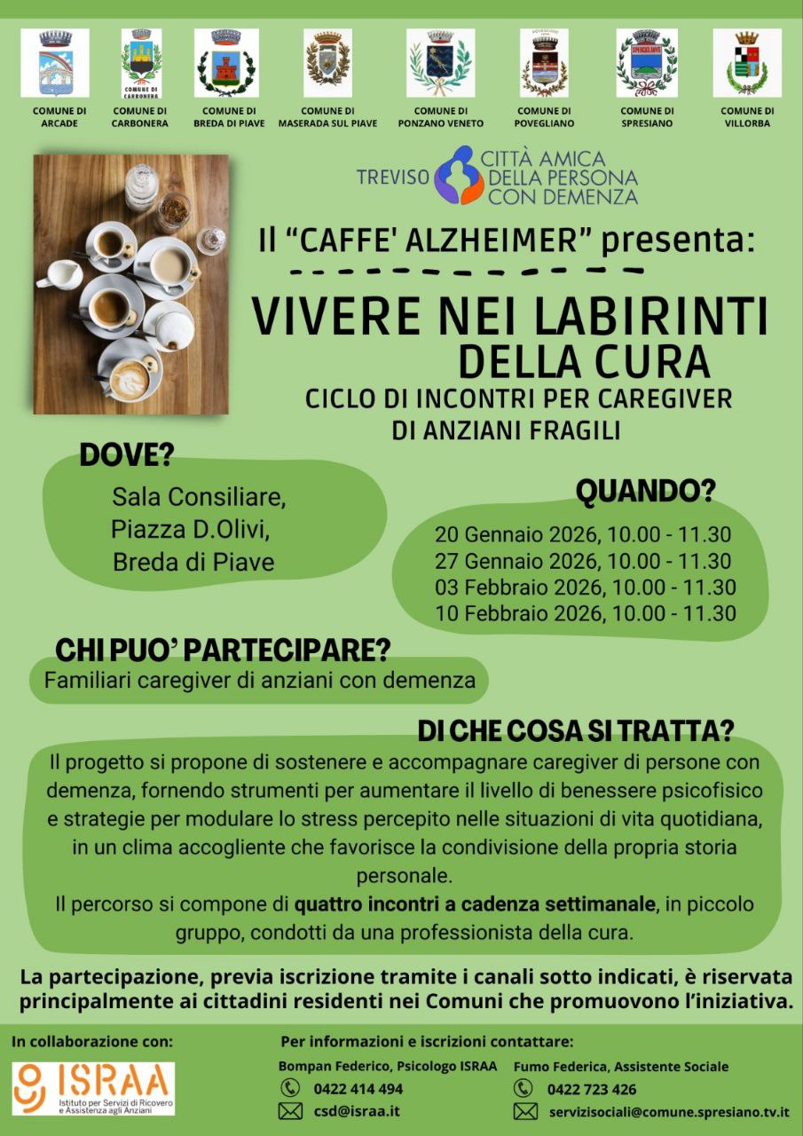 Condividiamo le nuove date di "Vivere nei labirinti della cura", inizialmente programmato per dicembre e successivamente annullato per improvvisa indisponibilità della conduttrice. Il percorso avrà inizio a Breda di Piave nella giornata di martedì 20 gennaio. Si ricorda che la partecipazione è riservata principalmente ai cittadini residenti nei Comuni che promuovono l’iniziativa. Ultimi posti disponibili. Per informazioni e iscrizioni contattate i numeri o le mail indicate nella locandina.