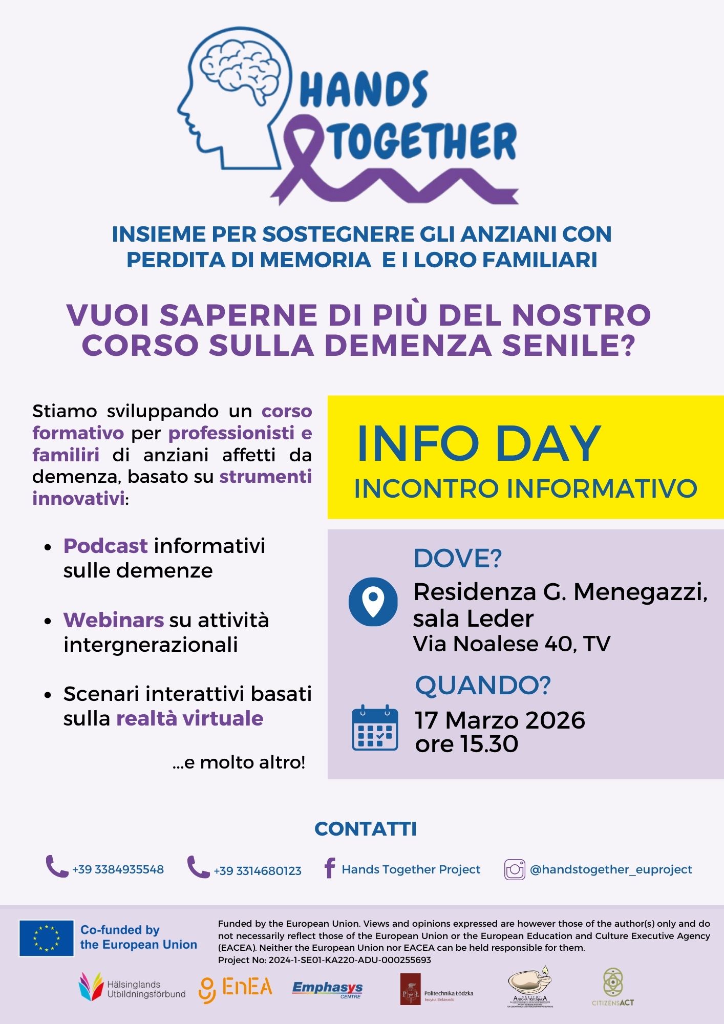 Il 17 marzo 2026 alle ore 15.30, presso la Residenza G. Menegazzi – Sala Leder (Via Noalese 40, Treviso), si terrà l’Info Day del progetto Hands Together, iniziativa europea dedicata al sostegno degli anziani con demenza e dei loro familiari.