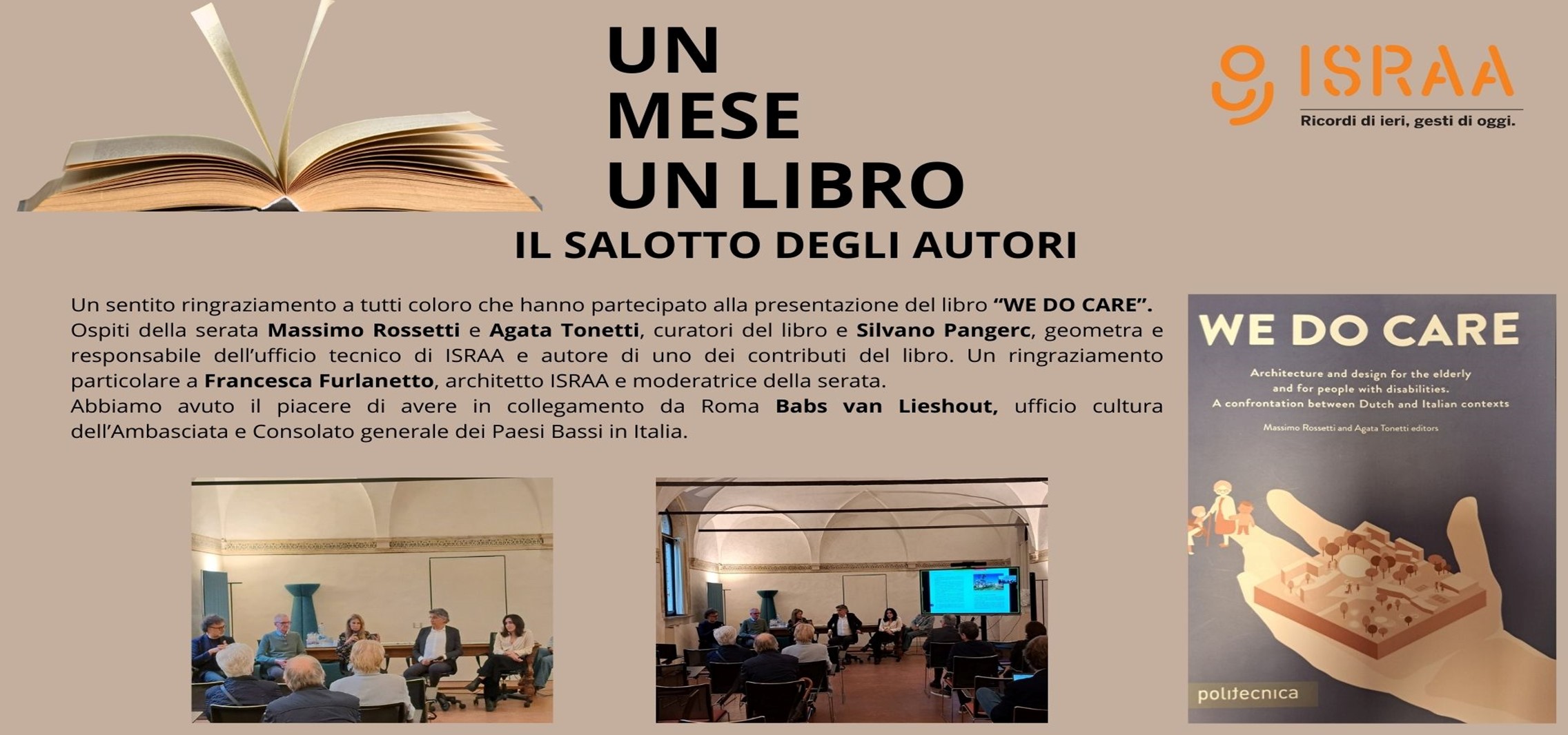 Ringraziamo quanti hanno partecipato alla presentazione, organizzata da ISRAA, di "WE DO CARE", libro che raccoglie i contributi presentati in occasione del convegno internazionale "We do care. Architecture and design for the elderly and for people with disabilities. A confrontation between Dutch and Italian contexts". Il convegno,organizzato dall'Università Iuav di Venezia e dall'Ambasciata del Regno dei Paesi Bassi in Italia, si è svolto il 15 dicembre 2022 a Venezia ed è stata l'occasione per mettere a confronto le realtà italiana e olandese sul tema della progettazione architettonica e urbana per anziani non autosufficienti e con disabilità, evidenziando punti in comune e differenze nella gestione di uno dei temi sociali più attuali nello scenario europeo.