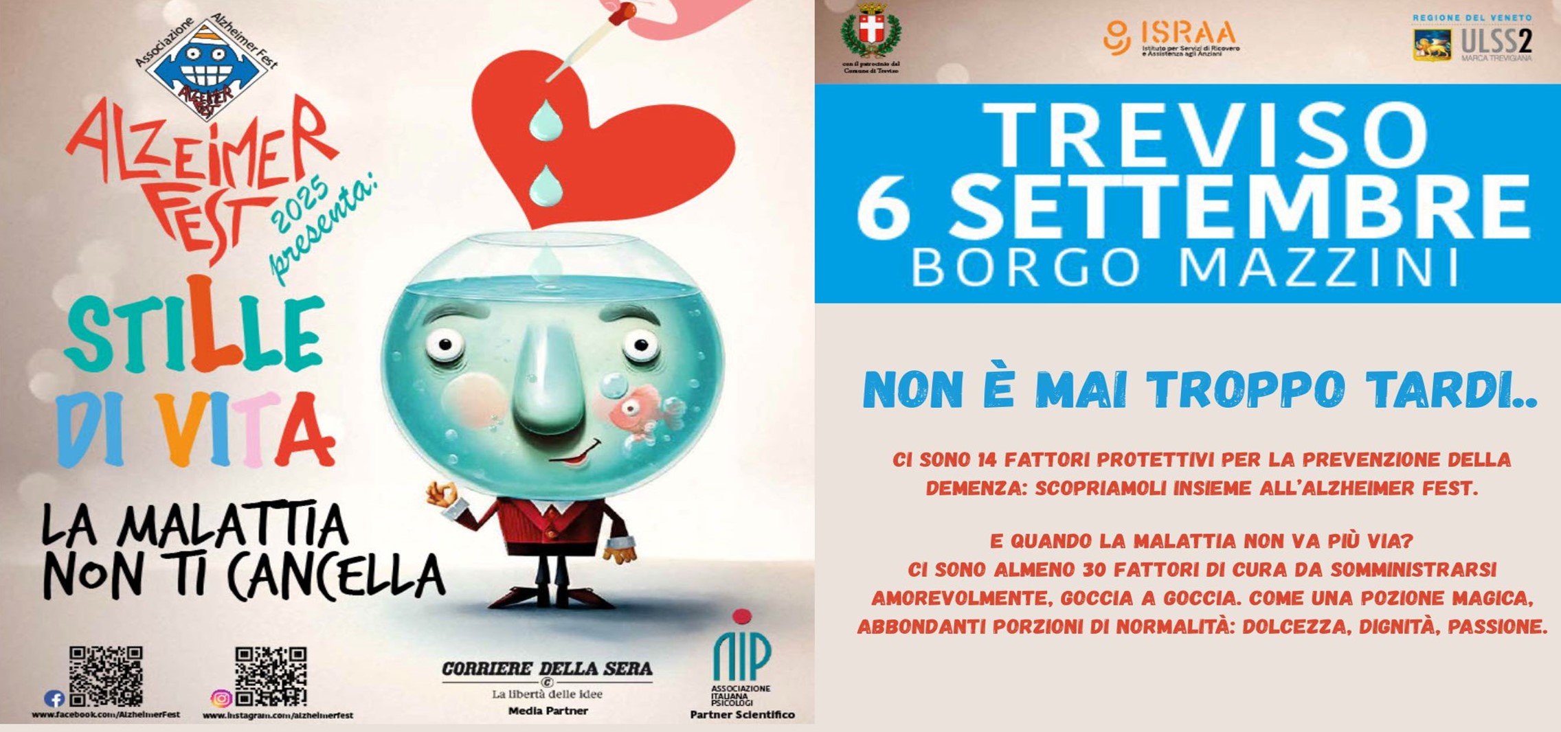 Il tour nazionale 2025 parte proprio da Treviso il 6 settembre! ISRAA organizza la prima tappa nel cuore della città: una giornata speciale, aperta a tutti, per vivere il tema della fragilità con leggerezza, creatività, bellezza e tanta umanità. Borgo Mazzini prenderà vita con un evento diffuso fatto di mostre artistiche, installazioni, musica dal vivo, incontri e conferenze dedicate alla prevenzione e ai fattori di rischio per la demenza, ma anche attività ludico- creative per anziani con i Centri Sollievo della Provincia, letture per bambini con la biblioteca BRaT, una sfilata per le strade della città al seguito dei FUNKASIN STREET BAND e molto altro.