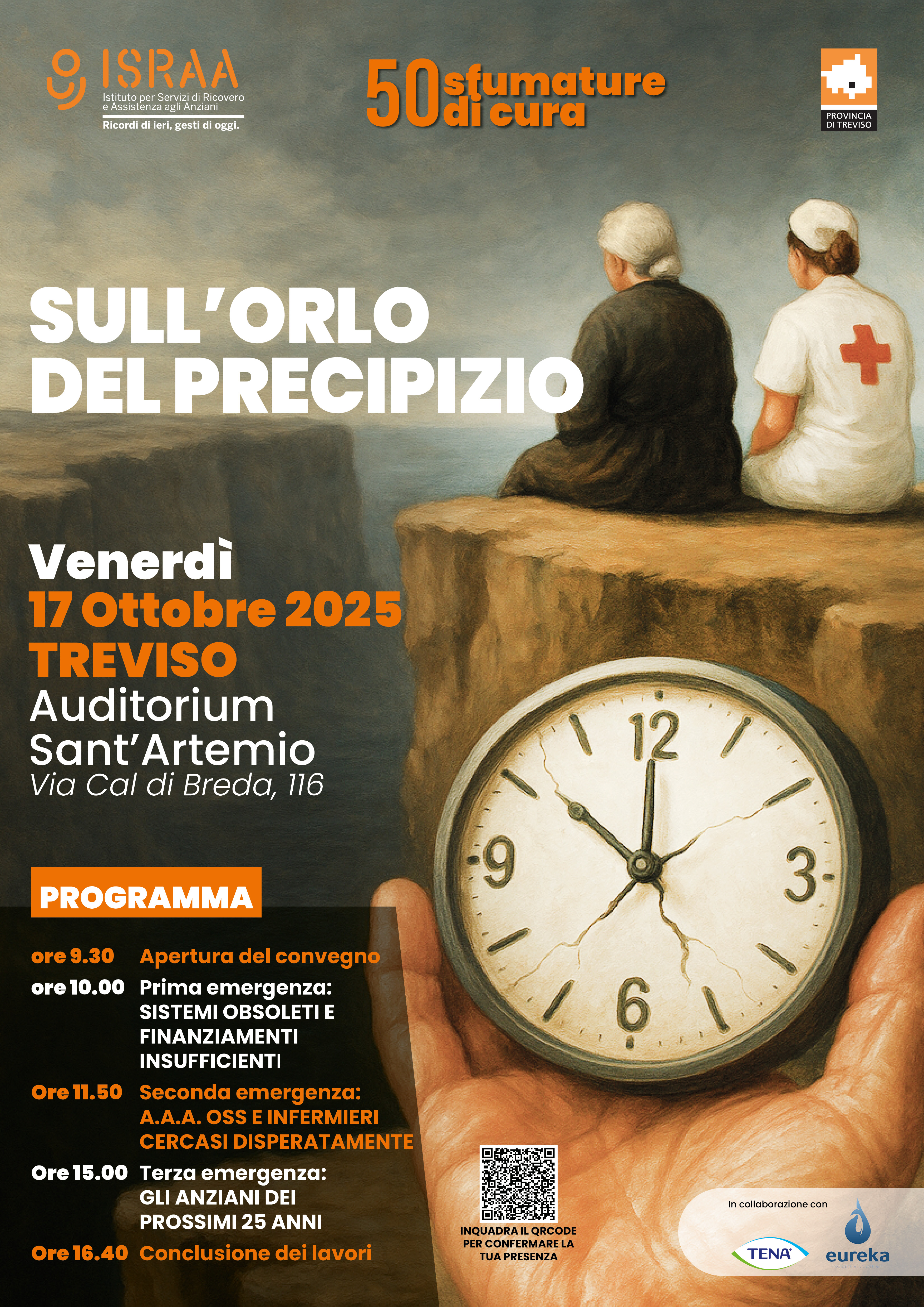 Segna la data! Il convegno si svolgerà venerdì 17 ottobre 2025 presso l'Auditorium della Provincia di Treviso. L'ingresso è gratuito, è gradita la prenotazione tramite il QR CODE presente sulla locandina in calce oppure cliccando al seguente link:https://www.eventbrite.com/e/biglietti-convegno-50-sfumature-di-cura-sullorlo-del-precipizio-1728471377419?aff=oddtdtcreator.